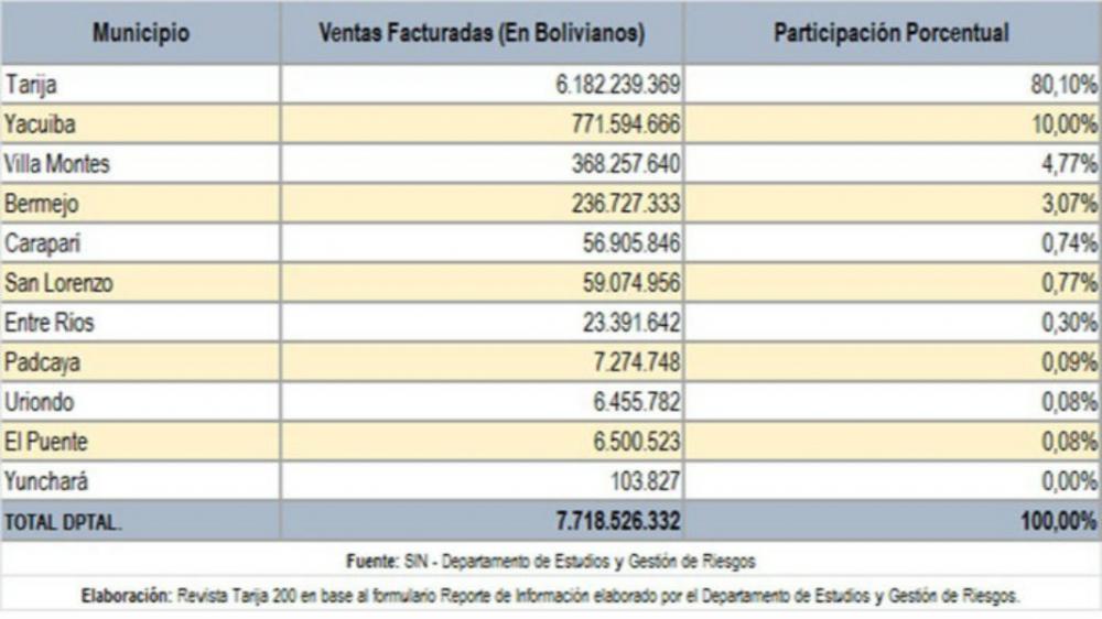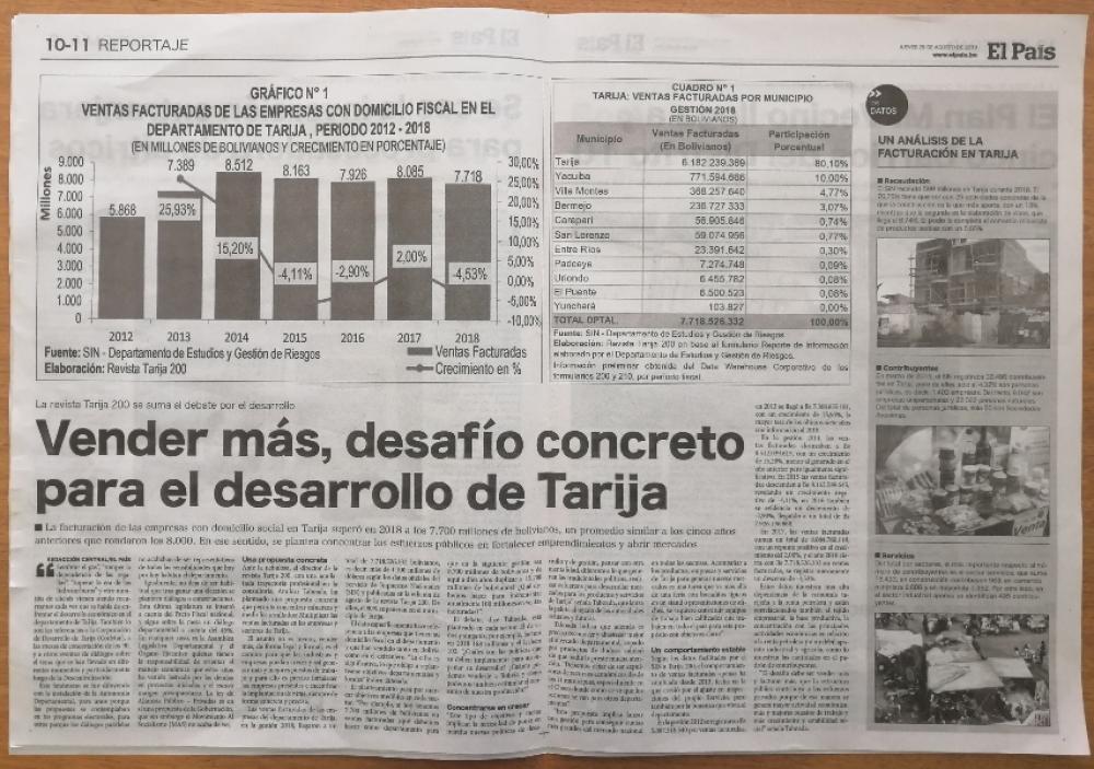 LA REVISTA TARIJA 200 SE SUMA AL DEBATE POR EL DESARROLLO En Cercado se concentran el 80,10% de las ventas facturadas en Tarija 02 Sep 2019 por El País