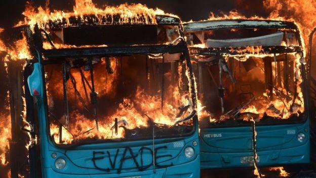 Las protestas causaron destrozos en decenas de estaciones del metro y varios buses incendiados.